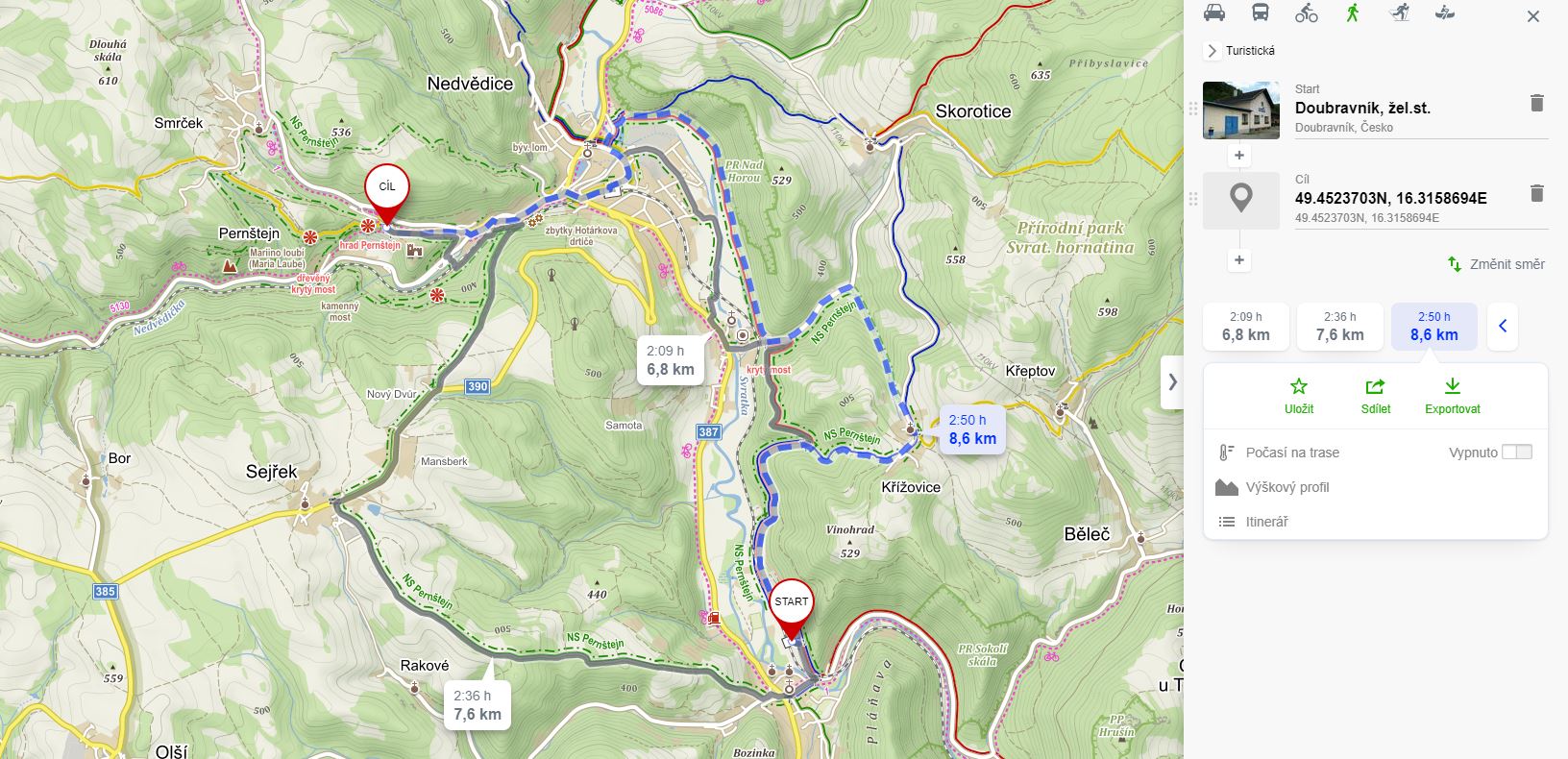 Dávám to do akcí bez podrobností, zatím vypadá jistý jenom směr. Vlaky přicházejí do úvahy dva. Přímý v 8:15 s příjezdem do Nedvědic v 9:09 nebo s přestupem v Tišnově - odjezd z Brna 8:53 a v Nedvědicích je v 9:56. Trasa může být klasická s tím, že vystoupíme v Doubravníku a půjdeme do Nedvědic a na Pernštejn.